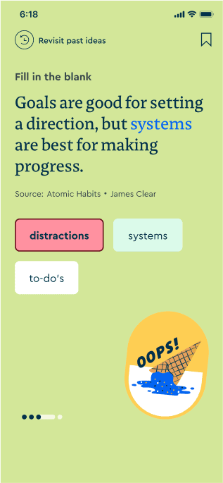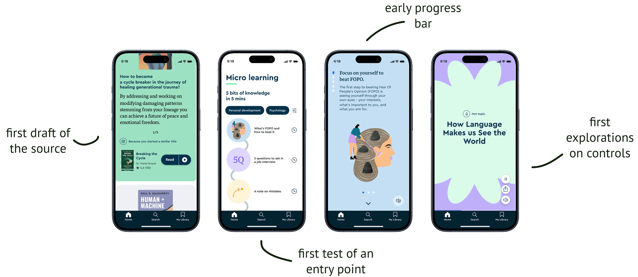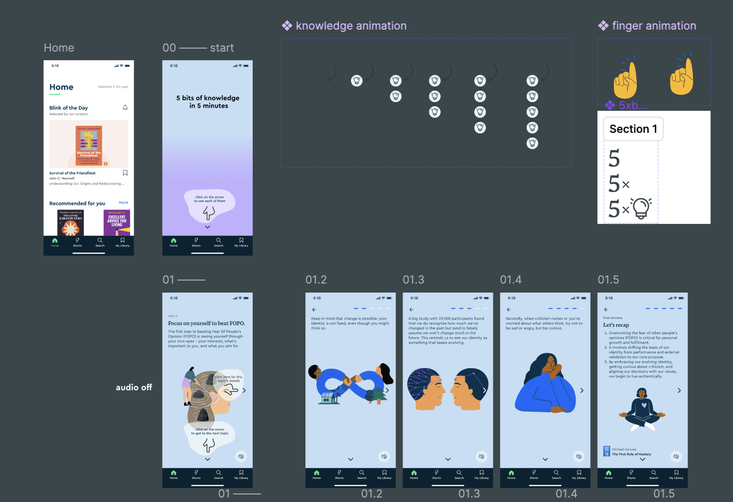 Meet micro learnings you can quickly consume and feel accomplished with. These short lessons needed to be fun and engaging, and at the same time they should be more visual than anything we had before (Blinkist is an audio-first app after all).